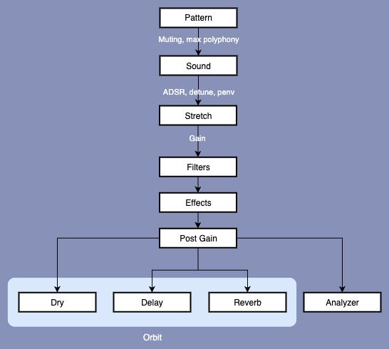 - The dry output, delay, and reverb are joined into what is called the “orbit” of the pattern (see more in the section below)