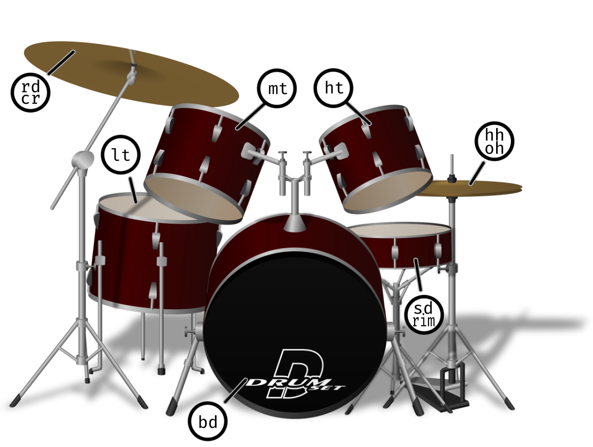 bd= bass drumsd= snare drumrim= rimshothh= hihatoh= open hihatlt= low tommt= middle tomht= high tomrd= ride cymbalcr= crash cymbal